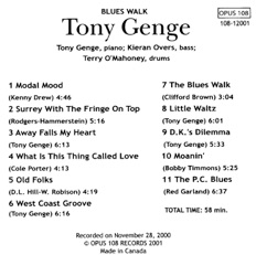 "Blues Walk is a beautiful CD with bassist Kieran Overs and drummer Terry O' Mahoney. Featuring four of Genge's delightful originals, several hard bop classics and cleverly reinvented versions of Surrey With the Fringe on Top, Old Folks and What Is This Thing Called Love, Blues Walk demonstrates Genge's understated keyboard eloquence. His surgical approach and his rhythm team's subtle support is the essence of swinging trio jazz."
